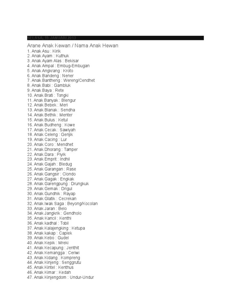 Arane Anak Kewan Dalam Bahasa Jawa - Arane Kembang Arane Anak Kewan Arane Godhong Arane Isi Pelajaran Jawa Untuk Anak Catatanairulbilal Com - Seperti meri untuk anak mentok/bebek, ada nener anaknya bandeng dan bledug panggilan anak gajah.